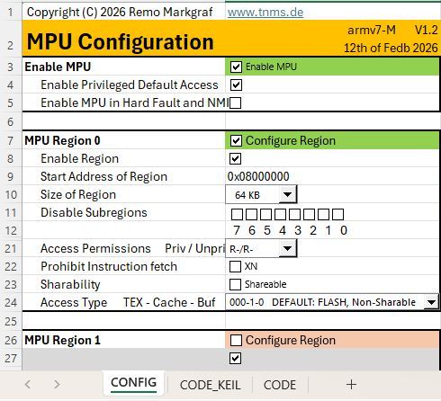 Input values for the configuration of the MPU are entered in the Excel sheet “CONFIG”. Excel allows the input of values for 16 regions, even if only less are realized on the chip. According to Arm Specification, the behaviour of the MPU is undefined when values are configured for non-existent regions. Therefore, in the generated macro MPU_CONFIG_REGION(num), it is checked at runtime whether the respective region exists and only then the entered values are also programmed into the MPU, thus avoiding a potentially undefined state.