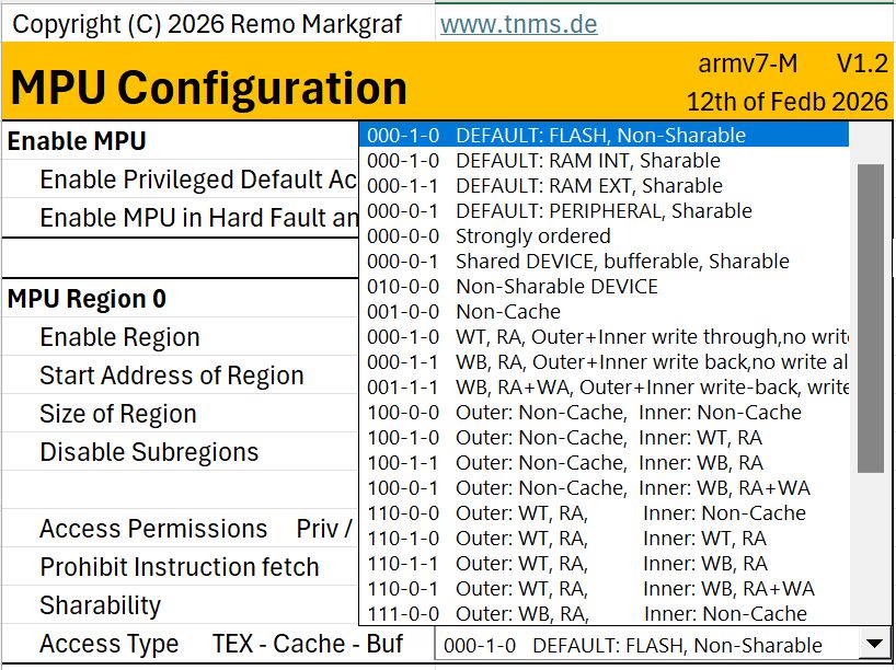 The Memory Protection Unit, or MPU for short, is an unloved child, although it is very important and helpful. The reason for the resentment lies in the nature of the matter, the MPU is not constructive, but uncovers software malfunction and prevents worse. It does not ensure that SW suddenly works, but rather the contrary, you spend hard work to get SW running under MPU control, that worked nicely without the MPU. So why should I do this? Because the MPU makes the SW safer and more stable and because the MPU is mandatory in safety-relevant applications. In order to simply the complex configuration, two free tools are presented here. The first is an Excel-based graphical MPU code generator and the second is a piece of C-code, MPU info, which outputs the settings of the MPU. Unfortunately many debuggers are not capable of doing this properly. With the introduction of the Armv8-M architecture, a new Protected Memory Software Architecture PMSAv8 has also been introduced, which means that the MPU of the v8-M is not backwards compatible with the v7-M. The different MPUs make the matter even more complex, … unloved child. Don’t worry, the two tools make life easier, as we don’t have to dive into the individual register details