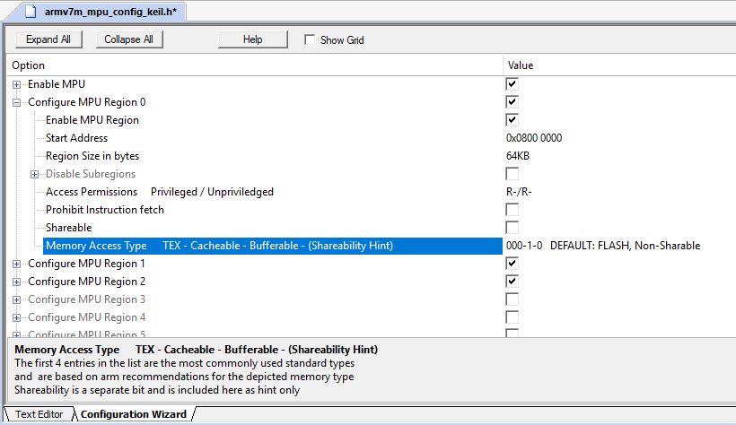 The last entry of a region is to enter a value for “TEX Cache Buf” that is required to control a potentially existing cache. Since in the armv7-M architecture a cache is only provided for the M7, you do not have to worry about these more complex settings in projects of the M0+, M3, M4. The defaults published by Arm for simpler cases are selectable via the top entries to ease the configuration (see Figure 3).