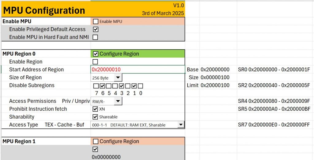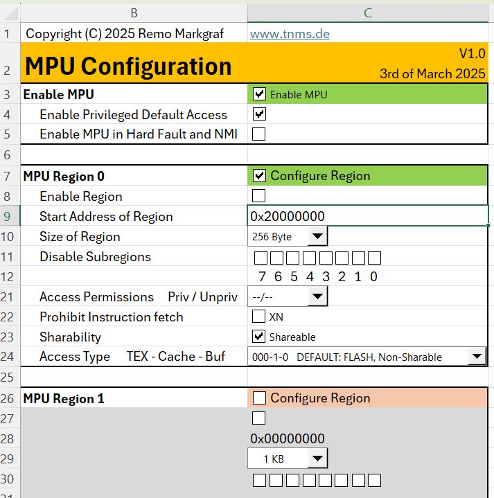 This MPU Configurator generates C-Code to program the PMSAv7 Memory Protection Unit of Cortex-M0+, M3, M4 and M7 devices. The generator is based on simple Excel functions and does not rely upon any macros or Active-X elements. The generated code is ouput of an Excel sheet and can easily be copied into your project by any editor of your joice. To configure the MPU you just need to include the copy-and-pasted include file and to call the generated inline function MPU_Init() from your project.